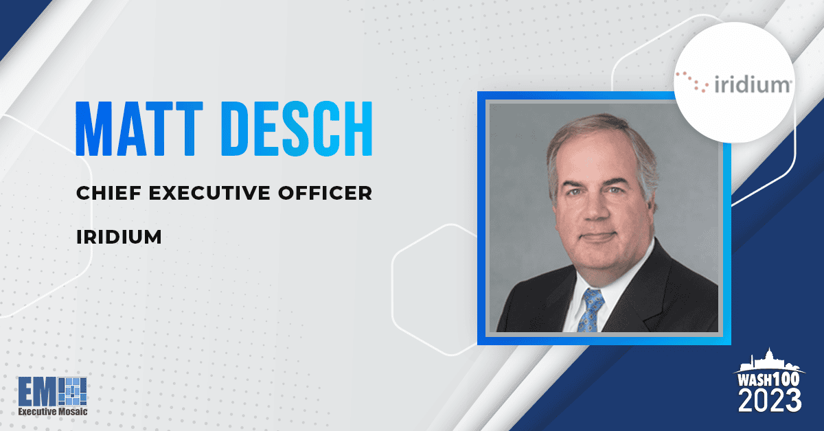 Executive Mosaic has the privilege of bestowing Matt Desch with the 2023 Wash100 Award. For the last nine years, the Iridium Communications CEO has secured a place among the most influential and impactful individuals working in government contracting and the U.S. government. He earns his ninth distinction from the voting body for impressive financial achievements — which heightened the earnings ceiling of his satellite company — and the steady creation of new partnerships.