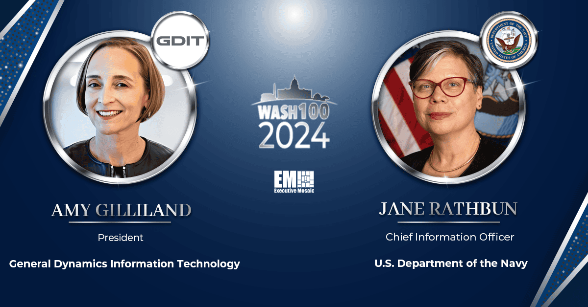 On Monday, Executive Mosaic recognized the accomplishments of 2024 Wash100 Award winners Amy Gilliland, president of General Dynamics Information Technology, and Jane Rathbun, chief information officer for the Department of the Navy.