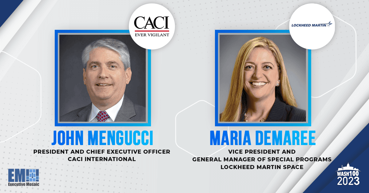 Today, Executive Mosaic is singing the praises of two private sector juggernauts in light of their induction to the 2023 Wash100 class. CACI CEO John Mengucci and Lockheed Martin Space General Manager Maria Demaree were commended in ExecutiveGov sister publications GovCon Wire and ExecutiveBiz for the feats that led them to be counted among the top government contracting executives in the U.S.