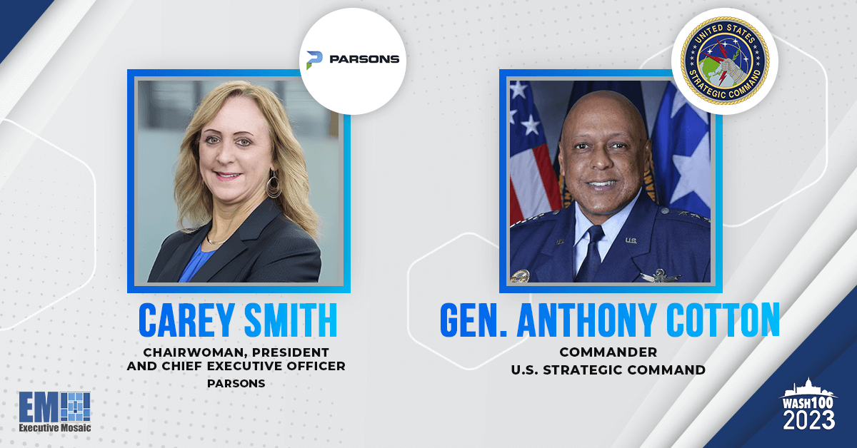 Parsons Chairwoman, President and CEO Carey Smith and United States Strategic Command Commander Gen. Anthony Cotton were individually celebrated on Thursday for their selection to Executive Mosaic’s elite 2023 Wash100 list.