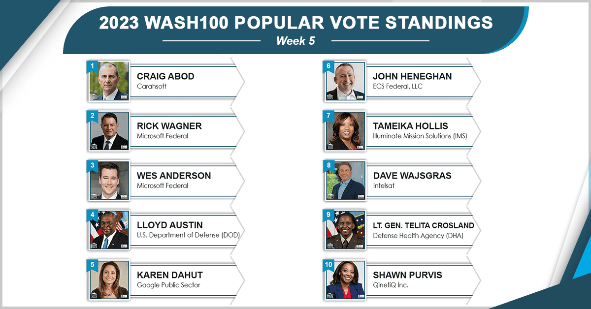 The top five — Carahsoft’s Craig Abod, Microsoft Federal’s Rick Wagner and Wes Anderson, Secretary of Defense Lloyd Austin and Google Public Sector’s Karen Dahut, respectively — held onto their positions throughout the week, rallying their fanbases enough to maintain their positions.