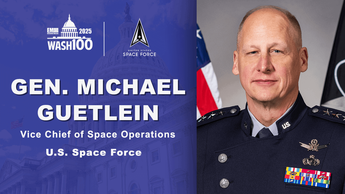 Gen. Michael Guetlein, vice chief of space operations in the U.S. Space Force, was inducted into Executive Mosaic’s prestigious 2025 Wash100 Award, which annually recognizes individuals for proven leadership and innovation as well as anticipated impact on the government and government contracting industry.